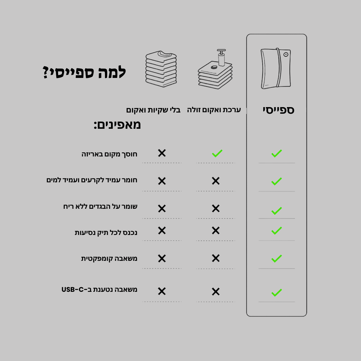 בין אם זה חופשה קצרה או טיול גדול – ספייסי הופך כל תיק קטן לארון מסודר ודחוס.